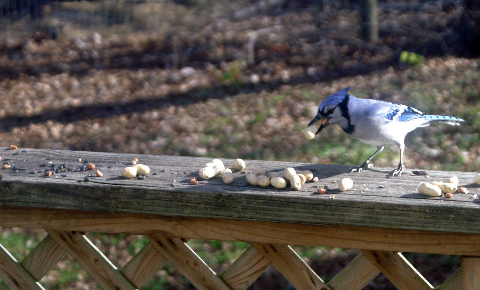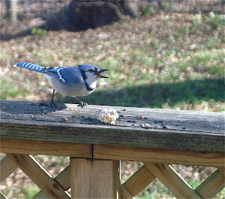 Suddenly, for no reason that I can find, we've been stamped "APPROVED." A blue jay couple visits every morning, scooping up peanuts both shelled and unshelled. Unlike many other situations I've read about, our jays don't bully the smaller birds, probably because we have so much food available and spread out over a large area.