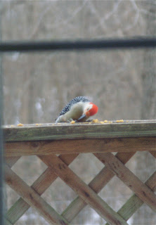 Their enthusiasm brought in some birds that are less familiar. The red-bellied woodpecker hangs around the trees all the time, but it's only since the weather chilled down that he came to the buffet line. He was initially attracted to the whole peanuts we were putting out for the blue jays, but he soon learned to like my homemade suet. His first approaches were timid and quick, only peeking over the edge of the railing while he perched vertically. Now, he hops around like he owns the place, and visits every day.