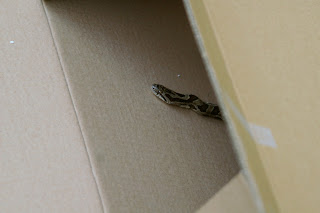 The agreeable snake stayed in one spot while I dashed into the building and got a big cardboard box from the storage room. Then we tackled the problem of how to get him into the box. "We could pick him up..." No one was volunteering. Almost as a joke, I asked "What if we just put the box on the ground and nudged him. Think he'd just crawl in?" I got a solid round of "Yeah, right" looks, but when I put the box down and nudged the snake with my foot, he slithered right inside. All of the yeah-righters were wide-eyed with awe. I was pretty amazed: how often does wildlife do what you want?
