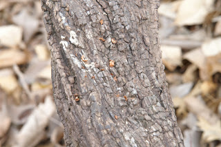 The darkest tree in the middle is the one that caught my attention today. It's a little awkward to get close to it. The leaf-covered slope is slick, and stems of poison ivy stick up here and there. Scores of small spiders dashed out of the way of my footsteps, probably screaming little arachnid versions of "AAAUUUGGGHH!"